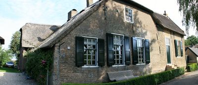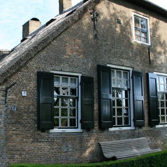 Boerderij met schilderachtig rieten zadeldak, dat zowel het woonhuis als de hogere stal overdekt. Puntgevel met vlechtingen en vensters met luiken en twintig- en zestienruitsroedenverdeling.