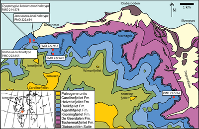 The Agardhfjellet Formation is a geological layer in central Spitsbergen made of dark, fine-grained mudstone that reveals much about ancient marine environments. The layers contain fossils of marine reptiles and many invertebrate creatures, showing researchers how ocean life developed over millions of years.