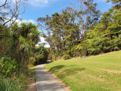 Ōkaurirahi / Kaurilands Domain is a park in the Auckland Region featuring forest areas and walking trails. The land contains multiple pathways that wind through native plants and clearings for visitors to explore.