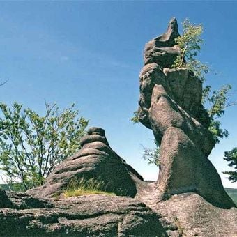 Sokolik can be reached via a metal ladder to its summit and offers views of the Karkonosze mountains on clear days. Another notable formation is Krzyżna Góra with balancing rock blocks that resemble figures or animals, inspiring local legends about ancient warriors and monks who once walked these paths.