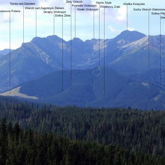 The Gęsia Szyja peak reaches an elevation of 1,489 meters and features curved dolomite rocks forming its distinctive summit structure.