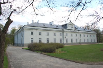 The Officer Cadets School building features a horseshoe-shaped design with two stories and stands within the Łazienki Park complex near the Palace on the Isle.
