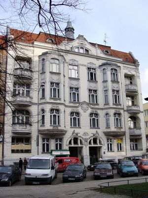 The tenement represents early 20th-century residential architecture in Szczecin, displaying Vienna Secession influences through flowing lines and ornamental details.