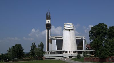 The modern ellipsoidal basilica features a 77-meter tower and resembles a ship, providing space for 5,000 worshippers beneath its contemporary architecture.