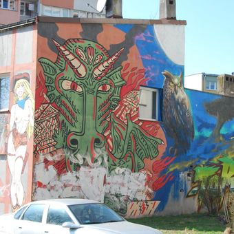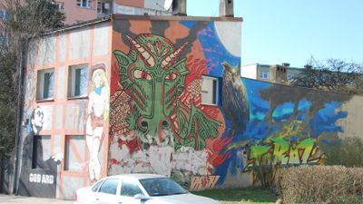Budynek przy ul. Srebrzyńskiej 21, budynek mieszkalny w Łodzi pokryty muralami