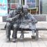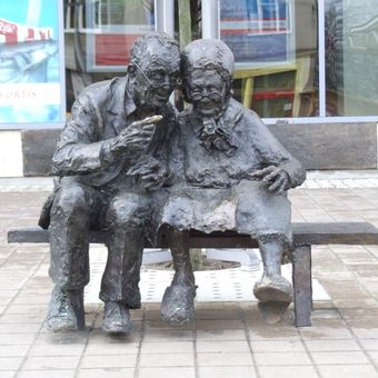 The bronze sculpture depicts an elderly couple sitting together on a bench, with the man pointing towards a specific building across the street.