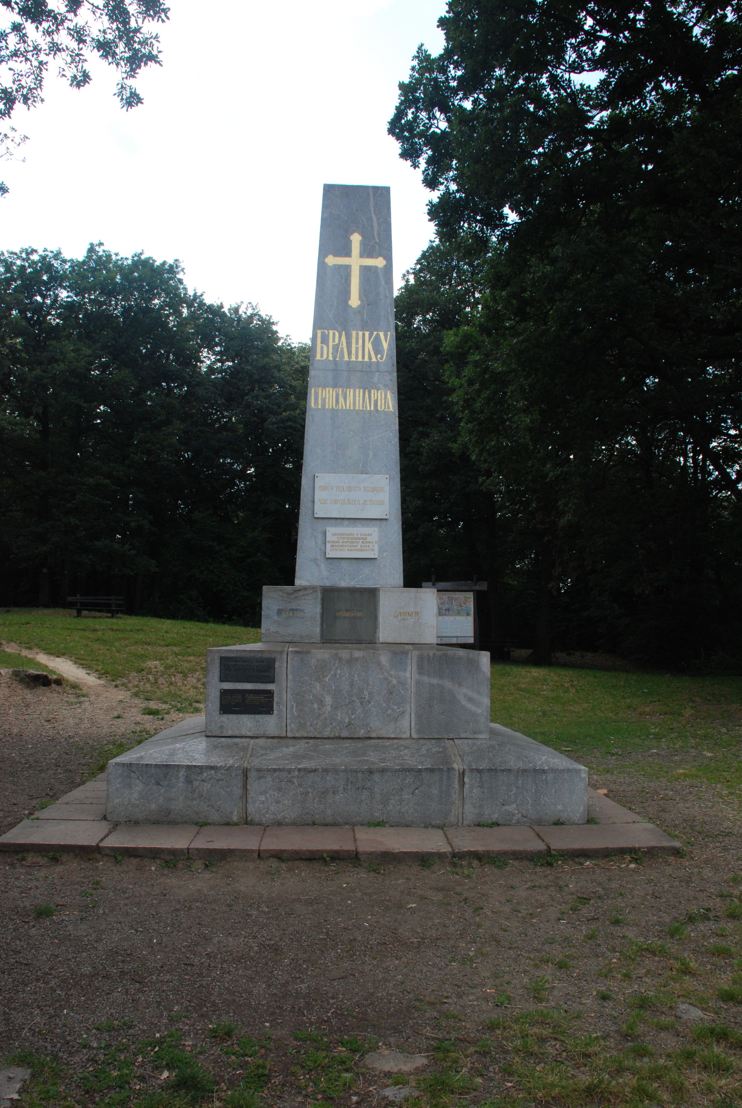 The monument incorporates materials from different Serbian regions and carries the inscription 'Branku - Serbian people' at its peak, representing national literary heritage.