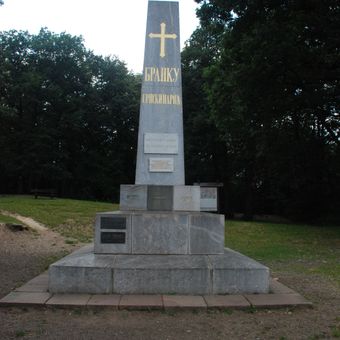 The tall stone obelisk marks the grave of poet Branko Radičević on a hill within Fruška Gora, near Sremski Karlovci, featuring a cross at its summit.