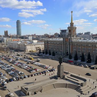 1905 Square is a central plaza in Yekaterinburg featuring administrative buildings, monuments, and public gathering spaces arranged across a spacious expanse. The area forms the heart of the city center with clear sightlines and multiple entry points.