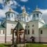 The monastery features stone walls surrounding a central cathedral with golden domes and white facades in traditional Russian Orthodox architectural style.