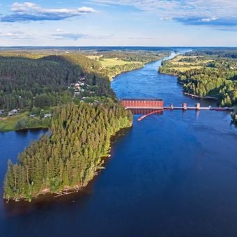 The Lesogorsky hydroelectric power plant stretches 146 meters along the Vuoksa River, generating 118 megawatts of electrical power for the surrounding region.