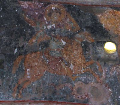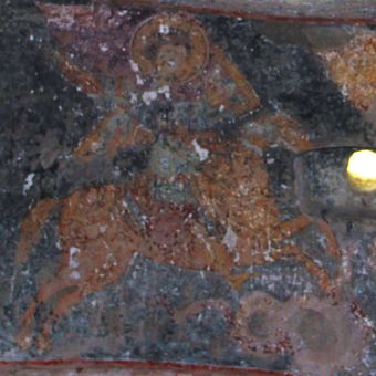The church preserves a northern wall fresco depicting three mounted figures, including Saint George, dating from the 12th to 13th centuries.