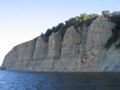 The slopes of Stolbichi rise above the Volgograd Reservoir, displaying geological formations shaped by natural processes over thousands of years.