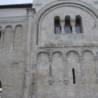 The Palace of Andrei Bogolyubsky is a white stone residence featuring a two-story tower with an internal spiral staircase. The tower connects via a corridor to an adjoining cathedral, and the preserved walls now stand within monastery grounds.