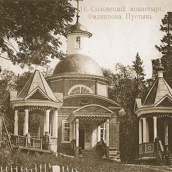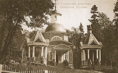 The Jesus Filippovskaya skete is a stone structure within the Solovetsky Monastery complex, featuring traditional Russian Orthodox architectural elements. The building sits on the larger island grounds as part of the religious settlement's collection of structures.