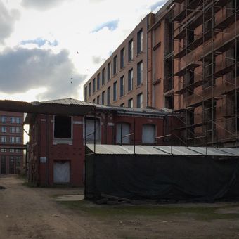 The former textile factory contains multiple brick structures that demonstrate the manufacturing architecture common in nineteenth-century Russian industrial developments.