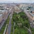 The garden square features paved pathways, mature trees, and benches arranged around a central area next to the bustling metro station entrance.