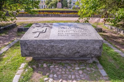 The monument marks the burial location of Finnish whiteguard members who participated in conflicts during the early twentieth century in Vyborg.