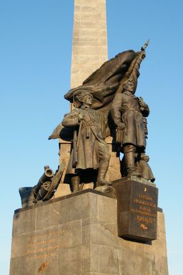 The monument features a 22-meter-tall gray granite obelisk topped with a bronze star, surrounded by three-meter-tall bronze statues at its base.