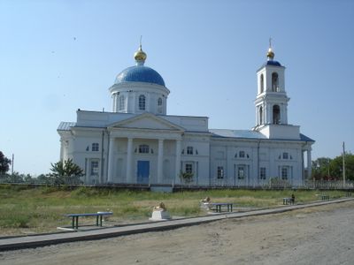 The Church of the Dormition of the Holy Mother of God stands with its traditional Russian Orthodox architectural features in the village center of Kalitvenskaya.