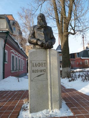 The monument features a half-length bronze bust of poet Afanasy Fet placed on a granite pedestal near the Writers' House.