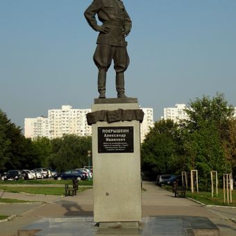 The monument incorporates elements of aircraft design in its base structure, reflecting Pokryshkin's development of vertical maneuver combat techniques.