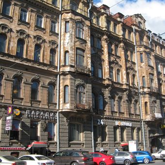 The building blends eclectic and Art Nouveau design, reflecting how Saint Petersburg's wealthy residents expressed their taste through architecture in the early 1900s. The ornate facade with bay windows and stucco details served as a statement of social standing for those who lived within.