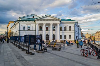 The Gentry Assembly Building is a neoclassical brick structure on Bolshaya Pokrovskaya Street in the center of Nizhny Novgorod. It displays symmetrical proportions, ornamental details, classical columns, and intricate moldings across its facade.