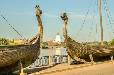 The Viking ships installation consists of narrow panel vessels positioned along the shore of Vyborg Bay in the Gulf of Finland.