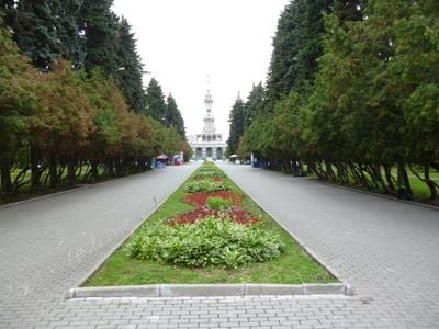 The park includes two restored four-level fountains with swan sculptures, historical monuments, and architectural elements reflecting Soviet-era design principles.