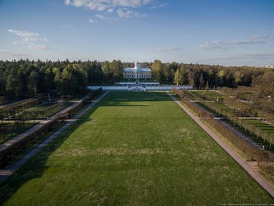 Arkhangelskoye Estate Museum is a grand palace complex with classical architecture, terraced grounds, sculptures, and fountains situated along the Moscow River. The property includes multiple exhibition buildings, extensive gardens, and a theater distributed across the estate.