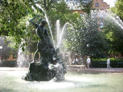 Tors fiske, Bronze fountain sculpture at Mariatorget, Stockholm.