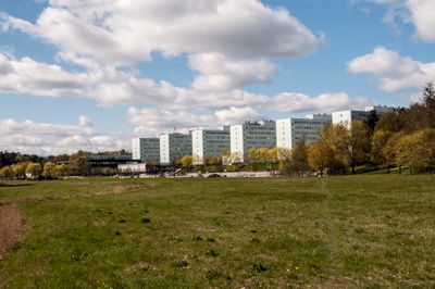 The industrial architecture of Södra huset features concrete structures and repetitive window patterns, reflecting the educational construction style of the 1970s.