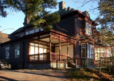 Villa Gadelius stands on Kaptensbacken hill, featuring a northeastern tower and an open veranda that overlooks the northern shore of Neglingeviken.