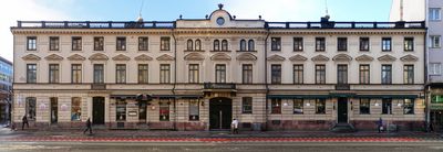 The Hellgrenska palatset stands at Götgatan 68, featuring a limestone staircase and ornate ceiling moldings throughout its multiple floors.