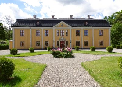 The main building at Tvetabergs säteri features yellow-painted wood paneling, light gray pilasters, and a metal-roofed high ceiling containing twenty rooms and a kitchen.
