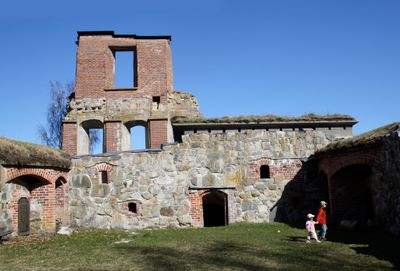 The ruins reflect how Swedish nobility displayed power and status through solid stone construction, with family emblems and architectural details visible on remaining walls. The scale of the structure tells visitors something about the social hierarchy and resources available to those who ruled from this place.