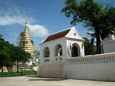 The temple features traditional Thai architectural elements with a central stupa and multiple smaller shrines spread across its grounds along the Lopburi River.