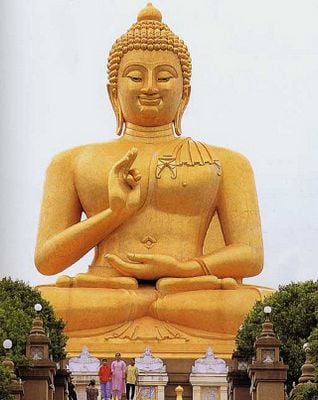 The temple houses a 23-meter tall golden Buddha statue in the Chola art style from South India, constructed with sacred soil from the Buddha's birthplace, enlightenment site, and place of passing into Nirvana.