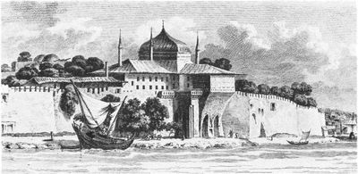 An 18th-century etching by Choiseul-Gouffier documents the historical appearance of this pavilion along the Marmara shoreline.