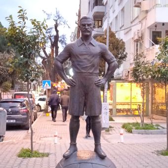 The Bornova Football Player Monument stands 2.7 meters tall, crafted by sculptors Neda İsmail Ata and Can Aktaş using bronze materials.