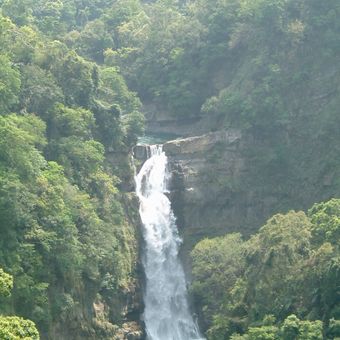 Xiao Wulai is a three-tiered waterfall that drops 55 meters into the Yunei Stream, a tributary of the Daxi River in northern Taiwan. The cascade forms a clear and direct flow down the mountainside within a forested valley.