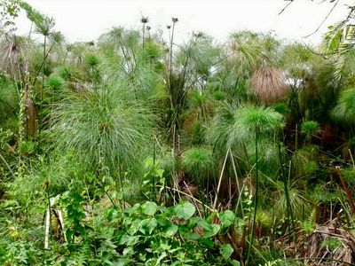 The wetland sanctuary extends over 4 square kilometers of papyrus swamps, creating an environment for 200 bird species and eight primate species.