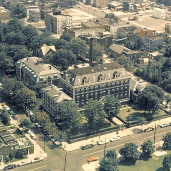 The Angel Guardian Home spans across the intersection of 12th Avenue and 64th Street, featuring Renaissance Revival and Beaux-Arts architectural elements designed by George Streeton.