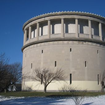The Arlington Reservoir features a circular stone rotunda containing a large water tank with a capacity of two million gallons at the summit of Park Circle.