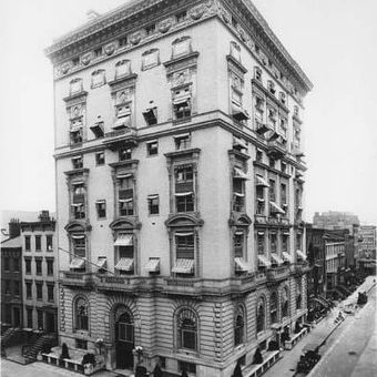 The Crescent Athletic Club House spans twelve levels with double-height windows, featuring a limestone base and light-colored brick adorned with terra cotta ornaments.