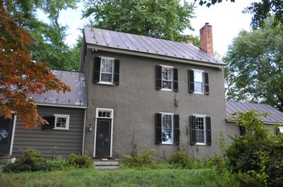The Federal style house stands on 12 acres of land, featuring post-and-beam construction with a stone foundation and stucco-covered weatherboarding.