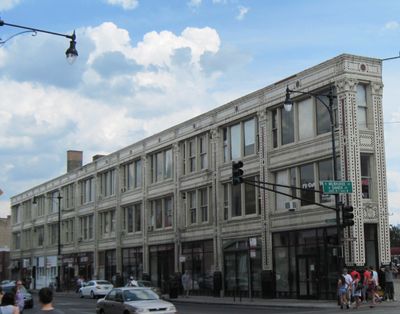 The North Side Chicago building represents a prime example of Victorian commercial architecture with its cast iron storefronts and elaborate window ornamentation.