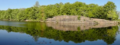Garret Mountain Reservation is a 568-acre protected natural area on First Watchung Mountain featuring grass fields, walking trails, and Barbour's Pond with views of the Paterson cityscape beyond. The grounds also contain various recreational facilities and natural habitats.