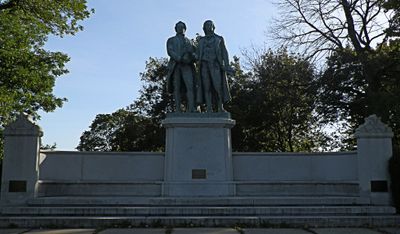 Located near the Emil Blatz Temple of Music, the bronze sculpture stands 12 feet tall on a 26-foot granite base containing inscriptions from both authors' works.